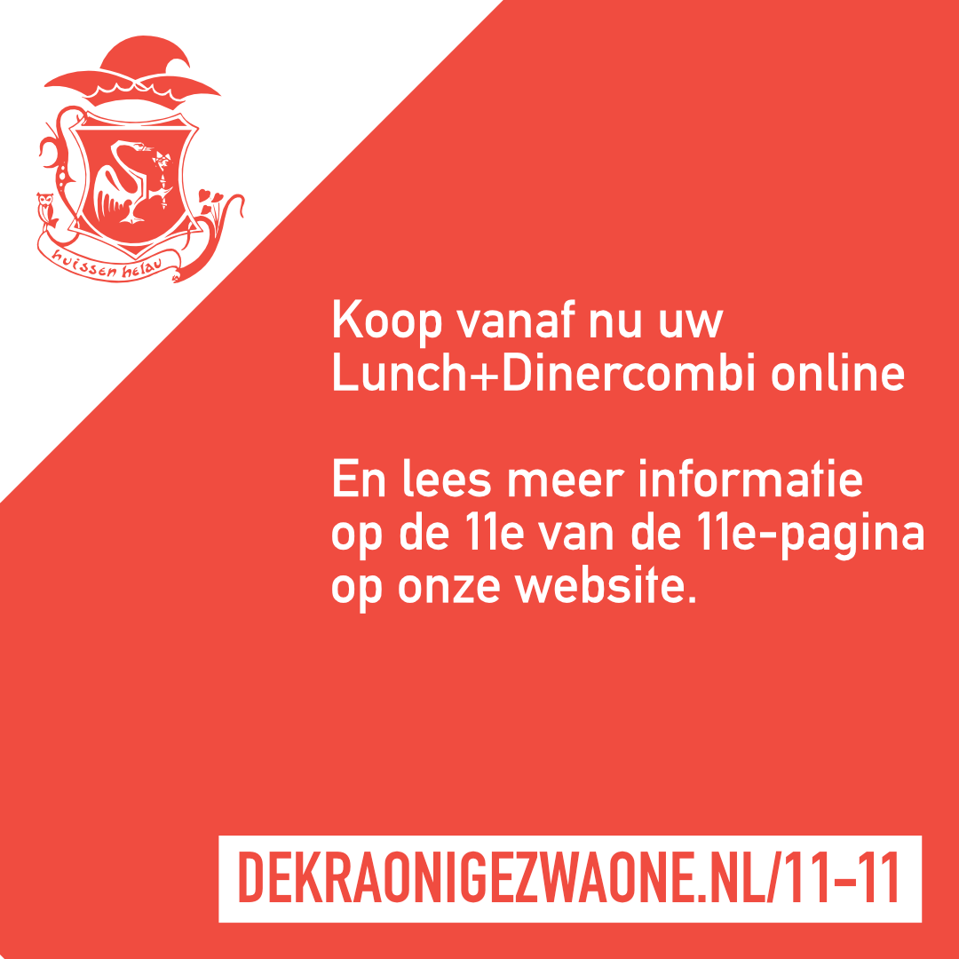 Voor deze lunch dient u een bon aan te schaffen. Dit kan enkel vandaag nog, en wel op dekraonigezwaone.nl/tickets/ (link in bio). Met die bon heeft u voor slechts €25 (excl. transactiekosten) recht op deze lunch, een diner bij de Buitenpoort om 16.55 en twee consumpties. Dus bestel die bon vandaag nog!!